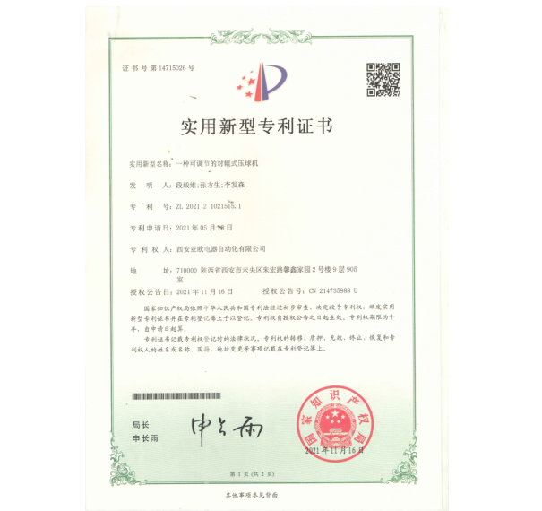 - 關(guān)于我們 - 資質(zhì)榮譽(yù) - 一種可調(diào)節(jié)的對(duì)輥式壓球機(jī)